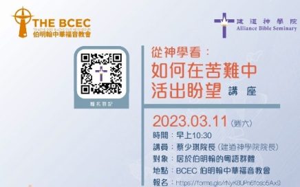 建道 *蔡少琪院長* 與 *葉松茂博士* 誠意邀請 *伯明翰的朋友* 參與 ?以下 *2023.03.11* 兩個講座 ? *合辦單位:建道神學院、伯明翰中華福音教會 (The BCEC)* 1️⃣《 *從神學看:如何在苦難中活出盼望* 》 講座 2023.03.11 (10:30am) 講員: *蔡少琪院長* (建道神學院院長) 對象:居於伯明翰的粵語群體 ********** 2️⃣《…